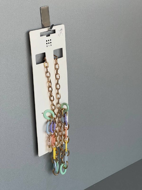 • طراحی: ترکیبی از زنجیر فلزی طلایی و حلقه‌های پلاستیکی رنگی