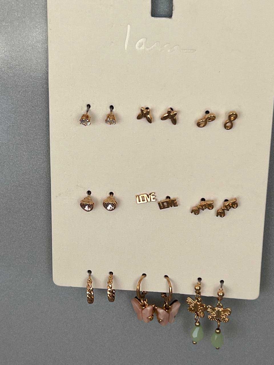 این ست 9 تایی گوشواره شامل گوشوارههای میخی کوچک و حلقهای در طرحها و فرمهای مختلف است. برخی از آنها دارای سنگهای براق و ظریف هستند، در حالی که برخی دیگر طراحیهای انتزاعی و مدرن مانند کلمه “LOVE” یا اشکال هندسی دارند. تنوع موجود در این ست گوشواره به شما این امکان را میدهد تا آنها را به صورت جداگانه یا ترکیبی با یکدیگر استفاده کنید. جنس این گوشوارهها به رنگ طلایی براق است که باعث میشود جذابیت خاصی به استایل شما اضافه کنند.