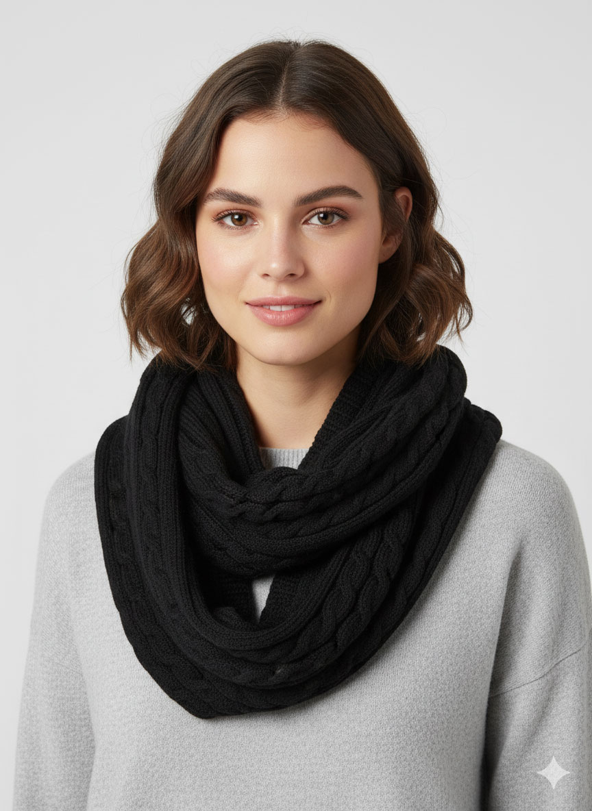 این شالگردن رینگی مشکی کابلی، یک سرمایهگذاری جاودانه در شیکپوشی و گرماست. همین امروز آن را به سبد خرید خود اضافه کنید!