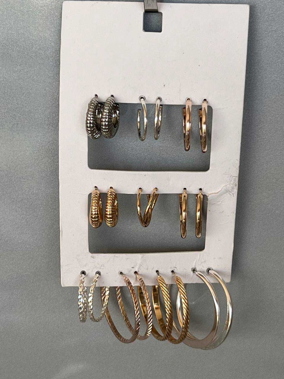 1. تعداد گوشواره‌ها: شامل 9 جفت گوشواره متنوع در سایزهای کوچک، متوسط و بزرگ.