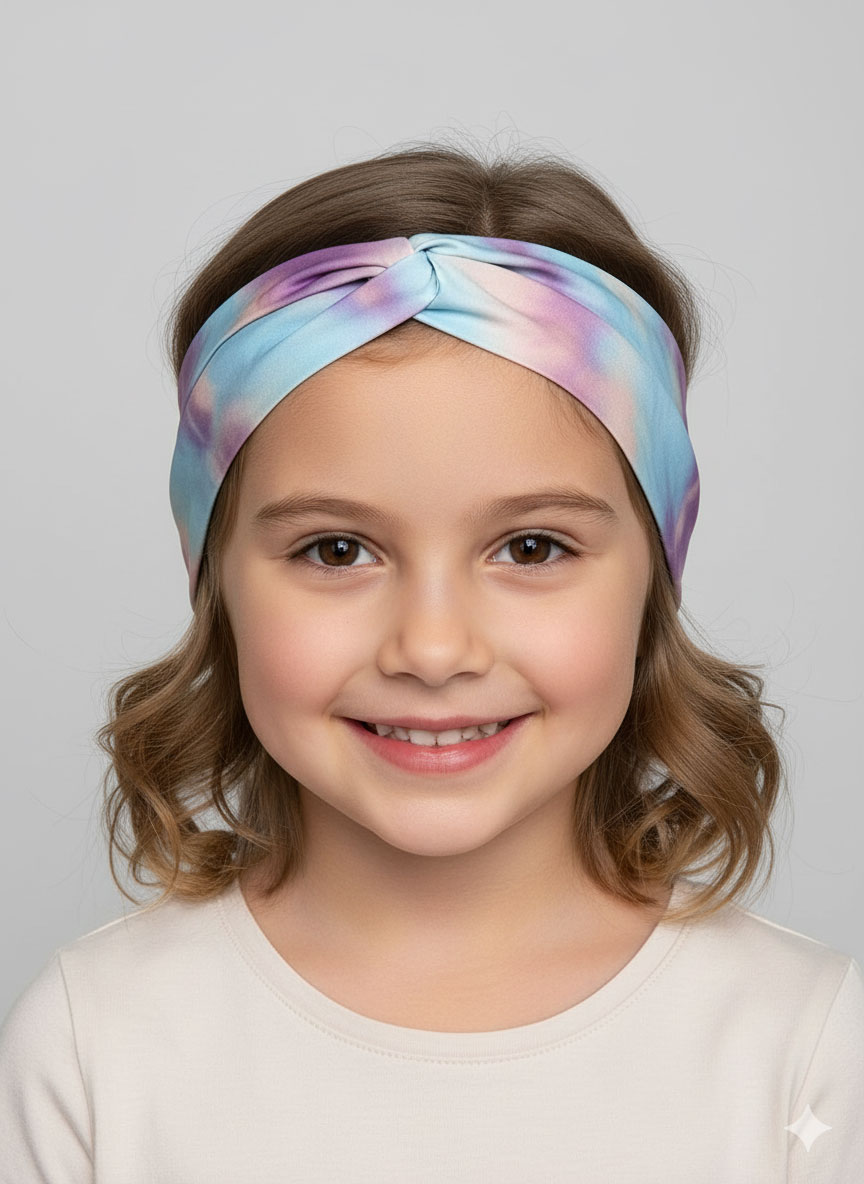۱. طرح و رنگ‌بندی خاص (تای‌دای پاستلی): بارزترین ویژگی این هدبند، طرح تای‌دای (Tie-Dye) یا ابر و بادی آن است. این طرح با ترکیب هنرمندانه رنگ‌های آبی آسمانی، صورتی ملایم، بنفش یاسی و هلویی روشن، حس آرامش و خیال‌انگیزی ابرهای آسمان را تداعی می‌کند. این رنگ‌های پاستلی، بسیار ترند و مورد علاقه کودکان و نوجوانان هستند و با افزودن لطافت به استایل، چهره را شاداب‌تر نشان می‌دهند.