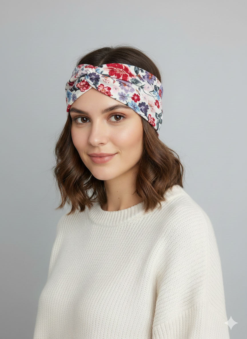 طراحی و ظاهر: هدبند دارای یک طرح گلدار بسیار جذاب و پرانرژی است که شامل گلهای بزرگ و کوچک با رنگهای متنوع روی زمینهای روشن (احتمالاً کرم یا سفید عاجی) است. رنگهای غالب شامل قرمز، صورتی، آبی کمرنگ، بنفش مایل به خاکستری و سبز تیره برای برگها هستند. این ترکیب رنگ، هدبند را به گزینهای عالی برای فصلهای بهار و تابستان تبدیل میکند، هرچند که در تمام فصول قابل استفاده است.