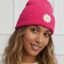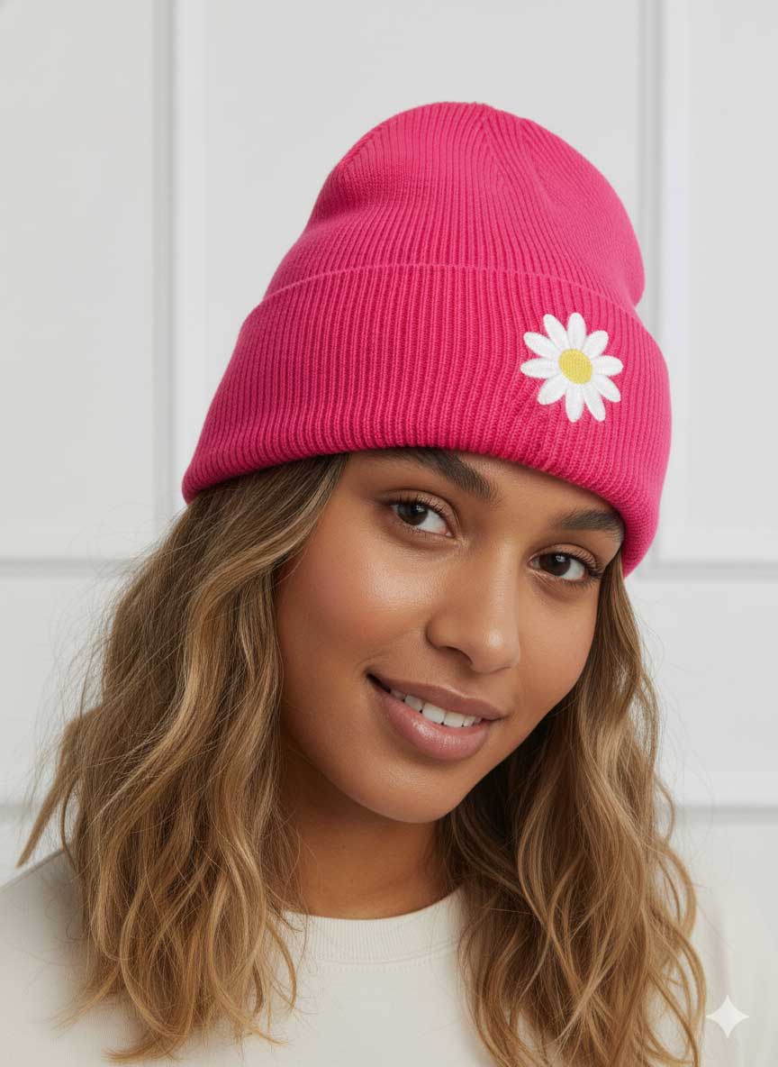 کلاه بافتنی سرخابی خیرهکننده با گلدوزی بابونه (دِیزی) سفید و زرد.