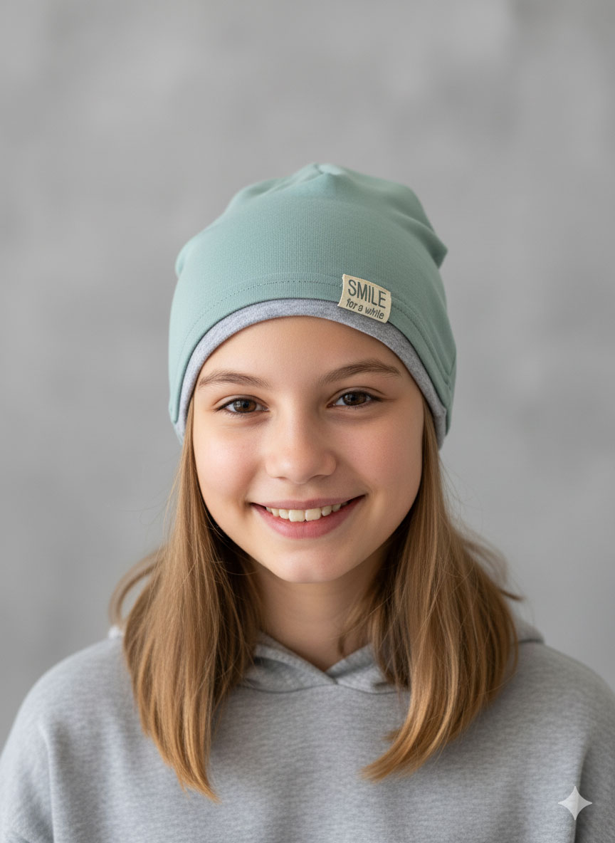 • طراحی کلاه Beanie: این کلاه به سبک Beanie طراحی شده که یک سبک مدرن و محبوب است. طراحی ساده و شیک آن باعث می‌شود که به راحتی با لباس‌های مختلف ست شود و ظاهری اسپرت و دوست‌داشتنی برای کودک شما ایجاد کند. یرنگ شیک و جذاب: کلاه دارای رنگ سبز پاستلی ملایم است که یک رنگ آرامش‌بخش و زیباست. برچسب کوچک و شیک «Smile for a While» به آن یک جلوه خاص و دلنشین می‌بخشد.