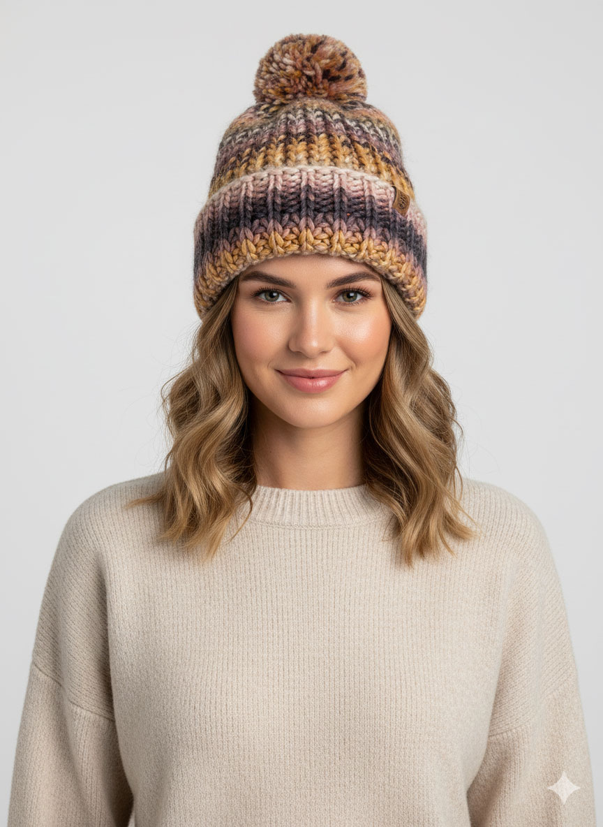 این کلاه زمستانی پومدار جذاب از برند Accessories، با طراحی مدرن و رنگهای گرم پاییزی، انتخابی ایدهآل برای روزهای سرد سال است. ترکیب رنگی خاص در بافت آن، از طیف قهوهای تا طلایی و صورتی ملایم، جلوهای دلنشین و متفاوت به استایل شما میبخشد. وجود یک پومپوم حجیم در بالای کلاه، آن را به یک اکسسوری دوستداشتنی و خاص تبدیل کرده است.