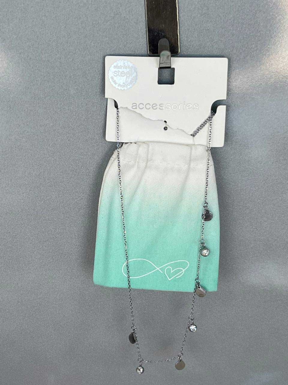 بستهبندی این محصول با یک کیسه پارچهای زیبا به رنگ گرادیان سبز-سفید عرضه میشود که نماد Infinity Love (بینهایت عشق) روی آن درج شده است. این طراحی نمادین نشاندهنده ابدیت و عشق بیپایان است و این گردنبند را به یک هدیه عالی برای عزیزان تبدیل میکند.
