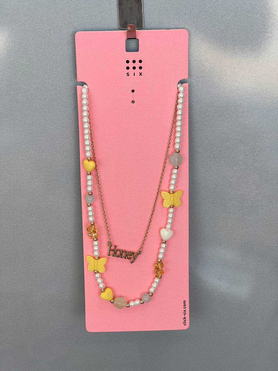 گردنبند ارائهشده از برند “SIX” دارای طراحی دو لایه است. در لایه اول، زنجیری طلایی با پلاک کلمه “Honey” قرار دارد که به زیبایی در میان گردن میدرخشد. در لایه دوم، مجموعهای از مرواریدهای کوچک و براق با جزئیات فوقالعاده زیبا مانند پروانههای زرد، قلبهای کوچک زرد و سفید و چندین سنگ رنگی دیگر به چشم میخورند. ترکیب این جزئیات شاد و فانتزی، استایل گردنبند را کاملاً منحصر به فرد کرده است.