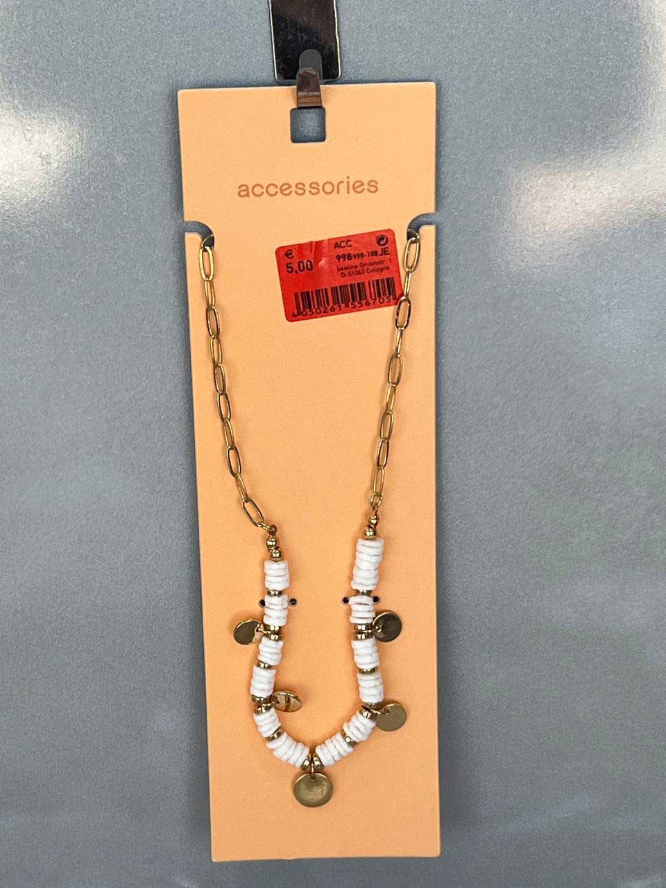 - طراحی جذاب: این گردنبند ترکیبی از زنجیر طلایی و مهرههای سفید رنگ است که زیبایی خیرهکنندهای را به نمایش میگذارد. مهرهها با نظم و ترتیب چیده شدهاند و استفاده از پلاکهای طلایی کوچک که در فواصل مشخص قرار گرفتهاند، جلوهای خاص به گردنبند داده است.